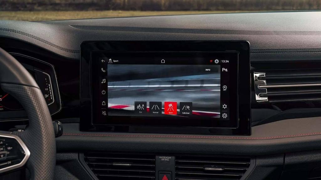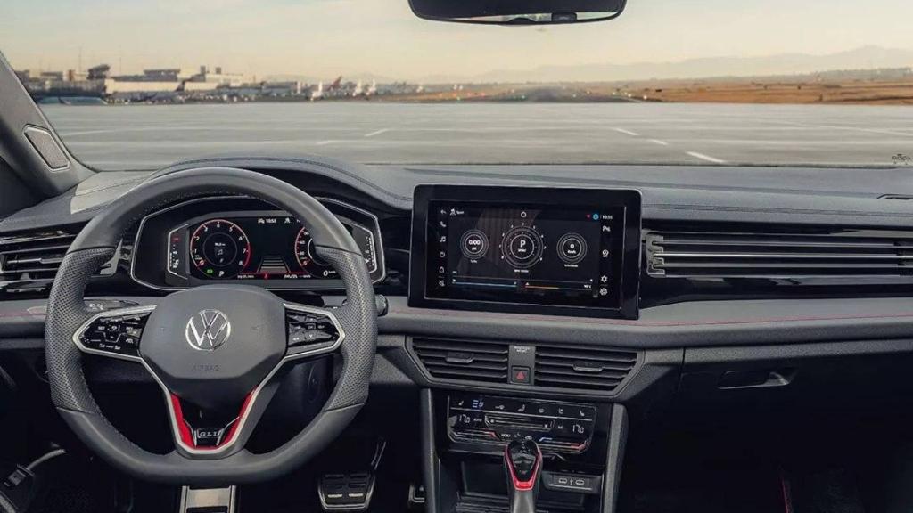 Ao entrar no Jetta 2026 GLI, você percebe o cuidado com acabamento, ergonomia e tecnologia embarcada. A central multinídia foi posicionada de forma mais elevada no painel, com tela de 10″ ou mais, dependendo da versão, tornando a interface mais moderna e intuitiva. O acabamento interno combina detalhes esportivos e premium: bancos com costura contrastante, volante multifunção com detalhes em vermelho, elementos de acabamento que remetem ao esportivo premium.