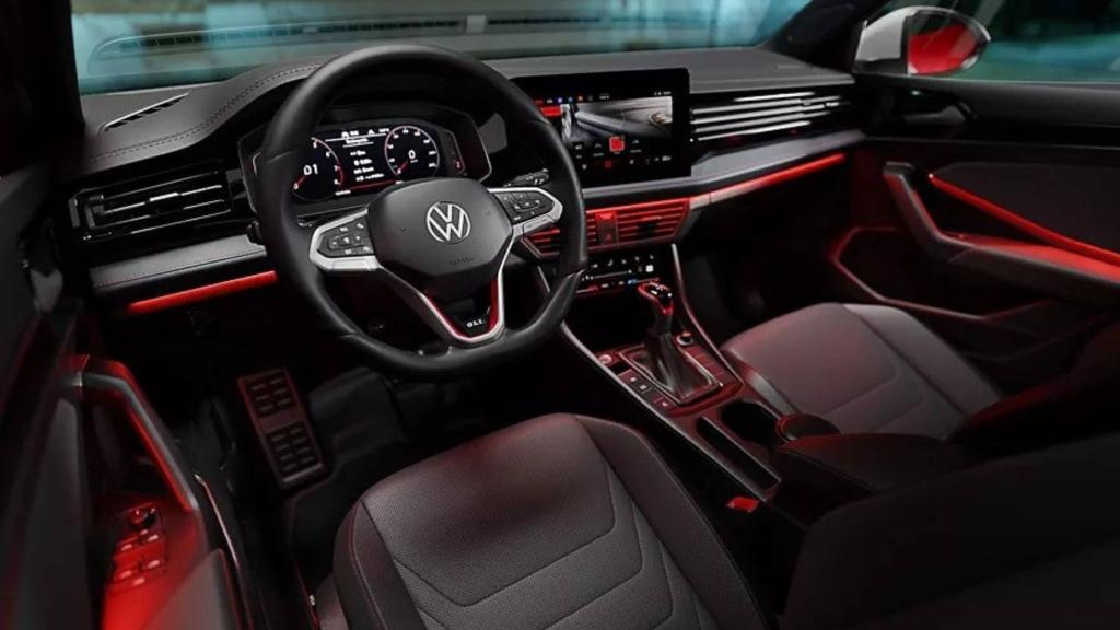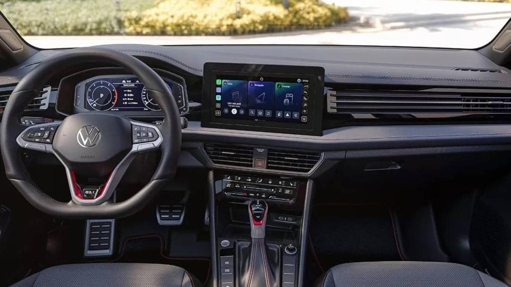 Ao entrar no Jetta 2026 GLI, você percebe o cuidado com acabamento, ergonomia e tecnologia embarcada. A central multinídia foi posicionada de forma mais elevada no painel, com tela de 10″ ou mais, dependendo da versão, tornando a interface mais moderna e intuitiva. O acabamento interno combina detalhes esportivos e premium: bancos com costura contrastante, volante multifunção com detalhes em vermelho, elementos de acabamento que remetem ao esportivo premium.
