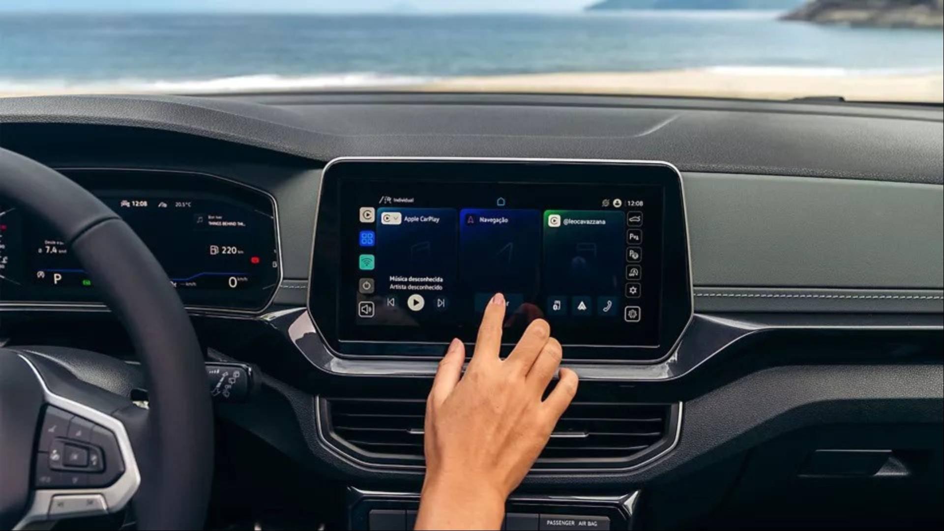 O interior do Volkswagen T-Cross 2026 foi totalmente atualizado, trazendo acabamento de qualidade superior, painel 100% digital e multimídia VW Play de última geração, com tela de até 10,1” e conexão sem fio para Android Auto e Apple CarPlay.
